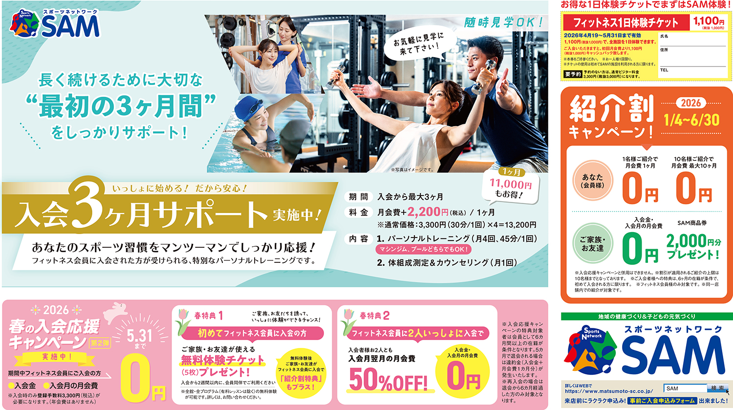 紹介された人(ご家族・お友達):入会金・入会月の月会費0円!さらにSAM商品券2,000円分プレゼント!