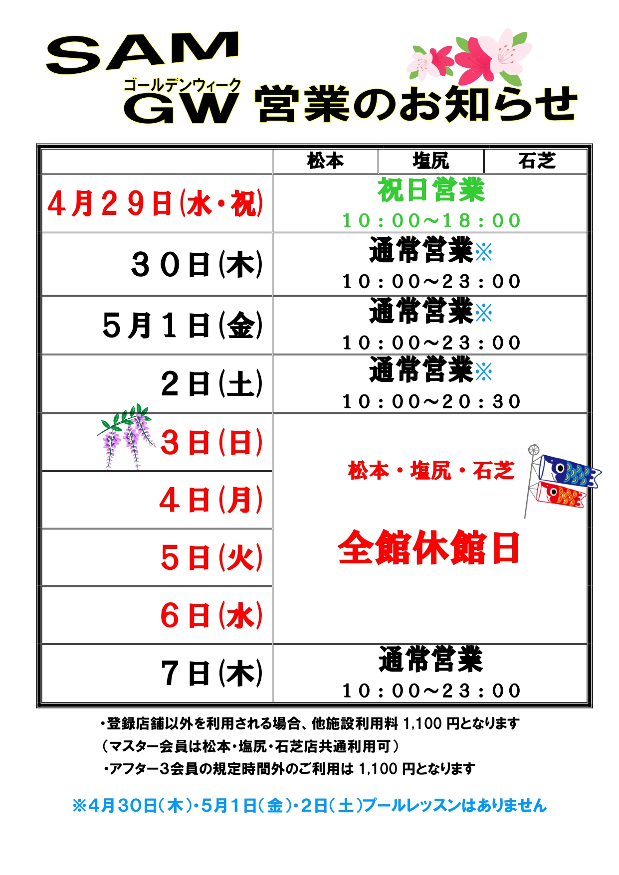 下記松本エリア、長野エリアのGW営業についてのご案内です。