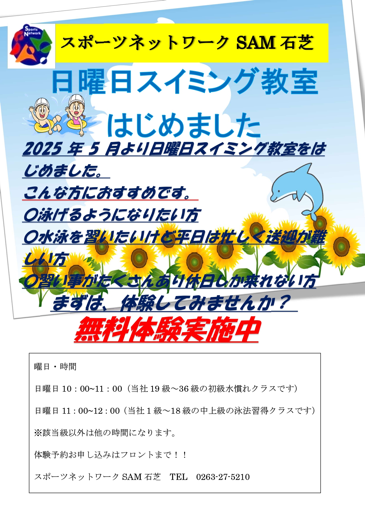 SAM石芝日曜日スイミング教室増設!!